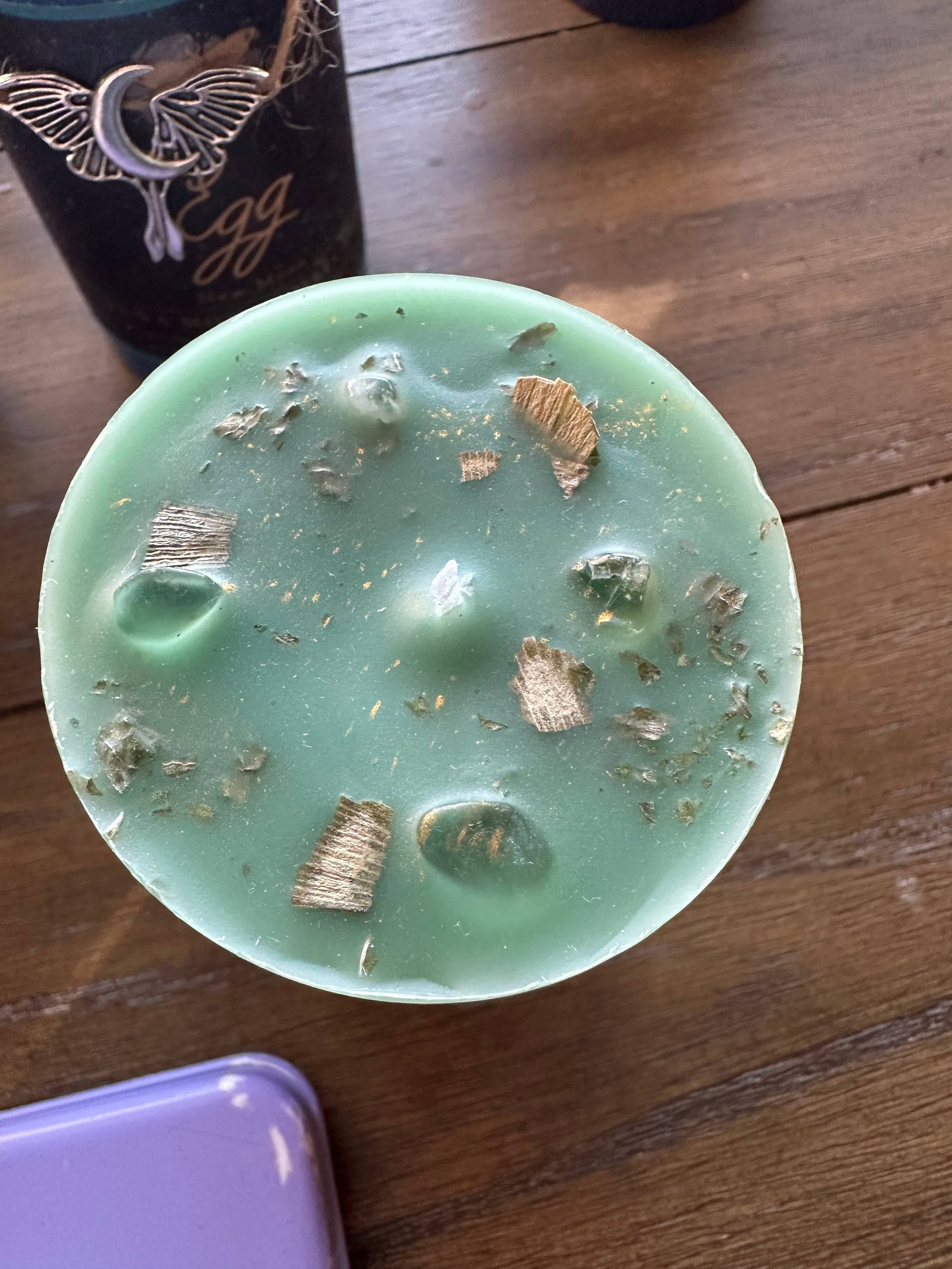 - Herbs & crystals rest on the surface. If any piece drifts toward flame: snuff, wait 1–2 min, nudge outward with a toothpick or remove to a dish.
