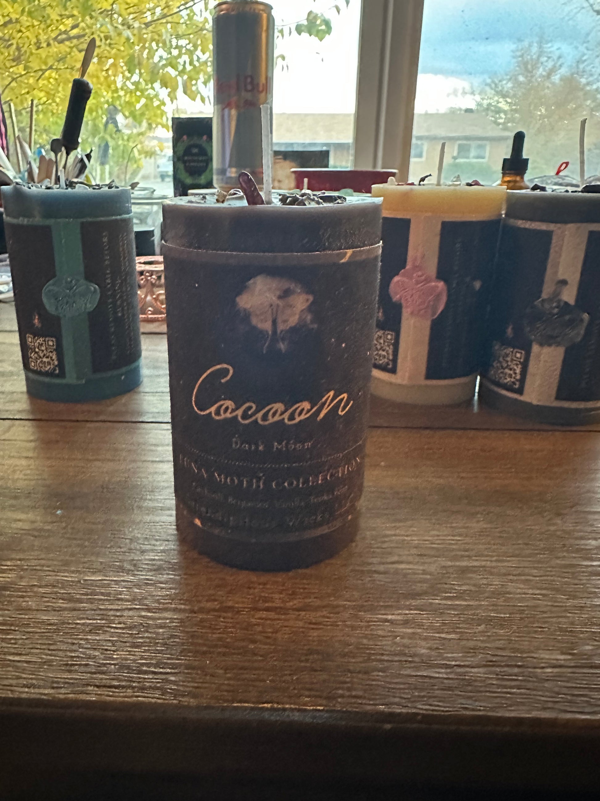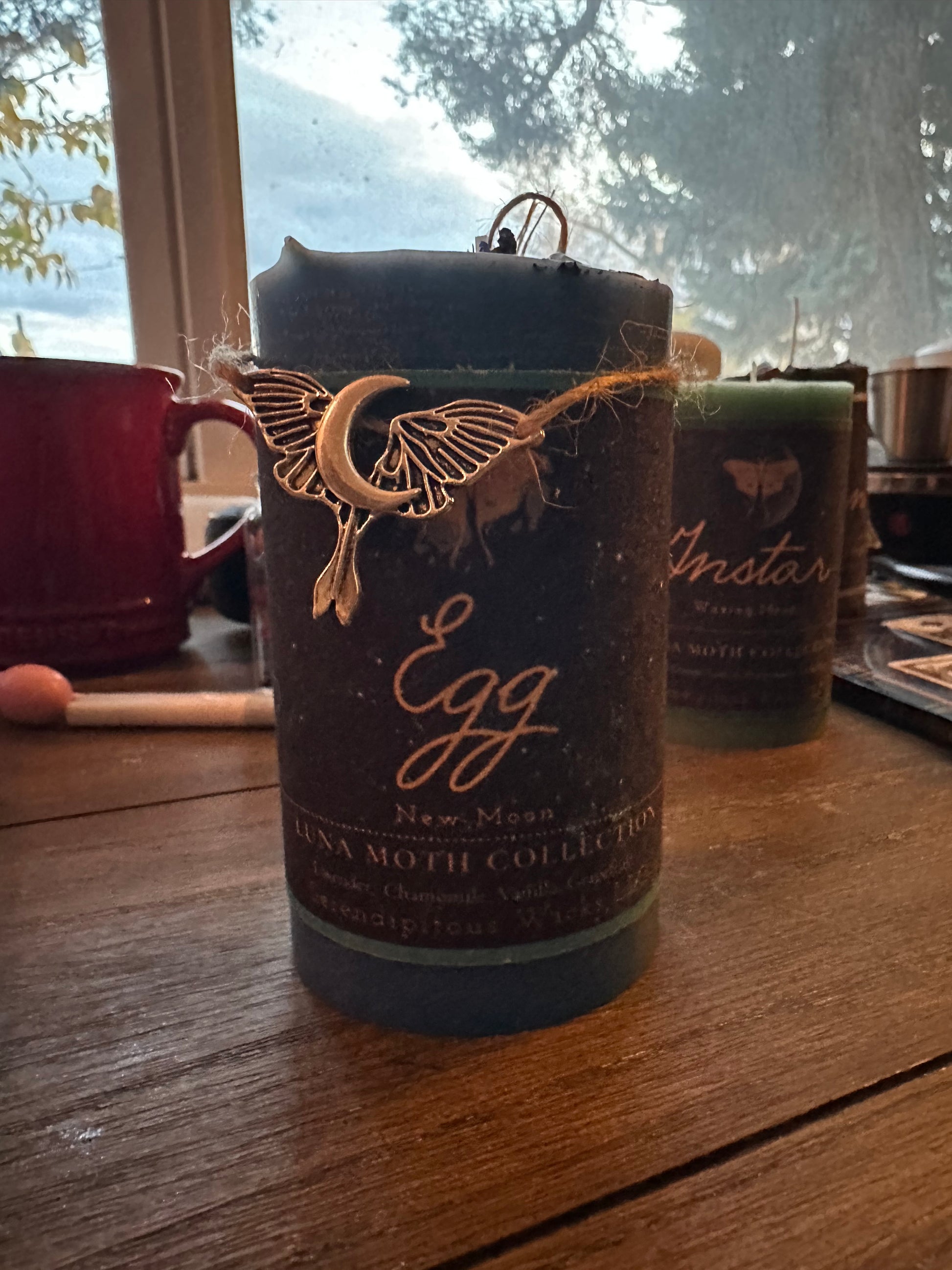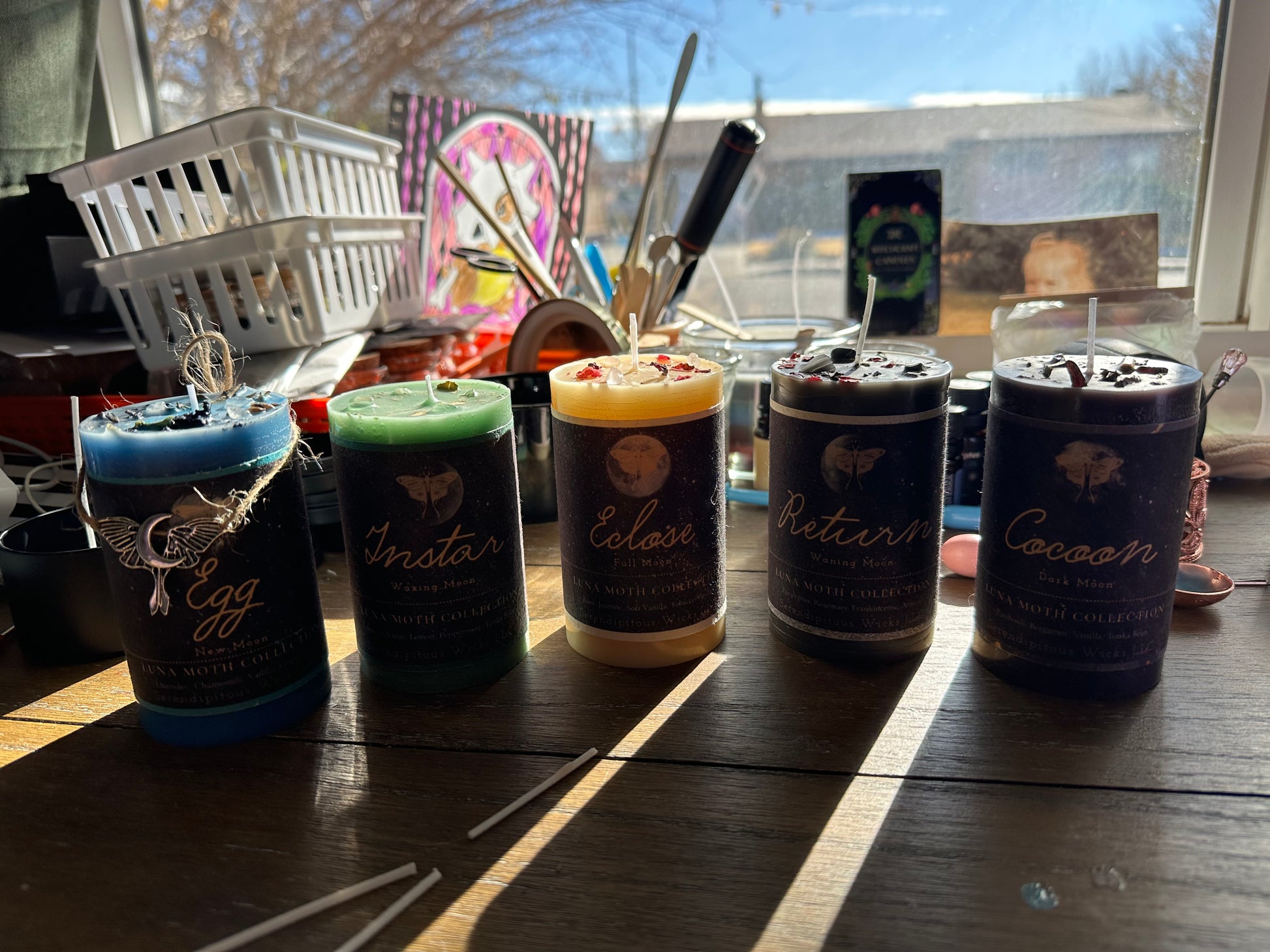 The Luna Moth Collection is a curated, non-customizable series of approximately 9 oz beeswax pillar candles, each aligned to a moon phase and a biological stage of metamorphosis. Every pillar carries a fixed scent blend, botanical allies, and crystal correspondences chosen for that specific threshold of transformation.