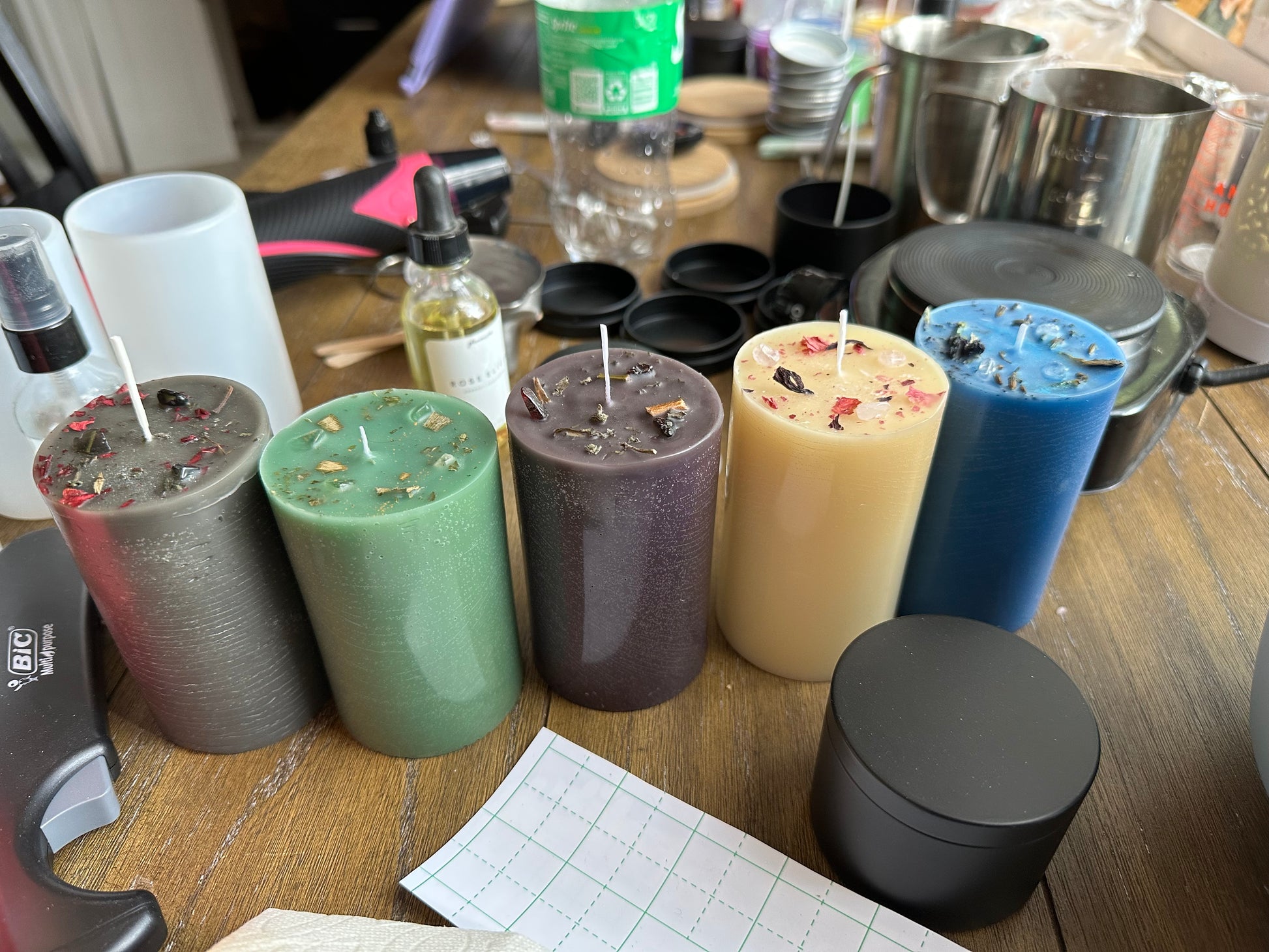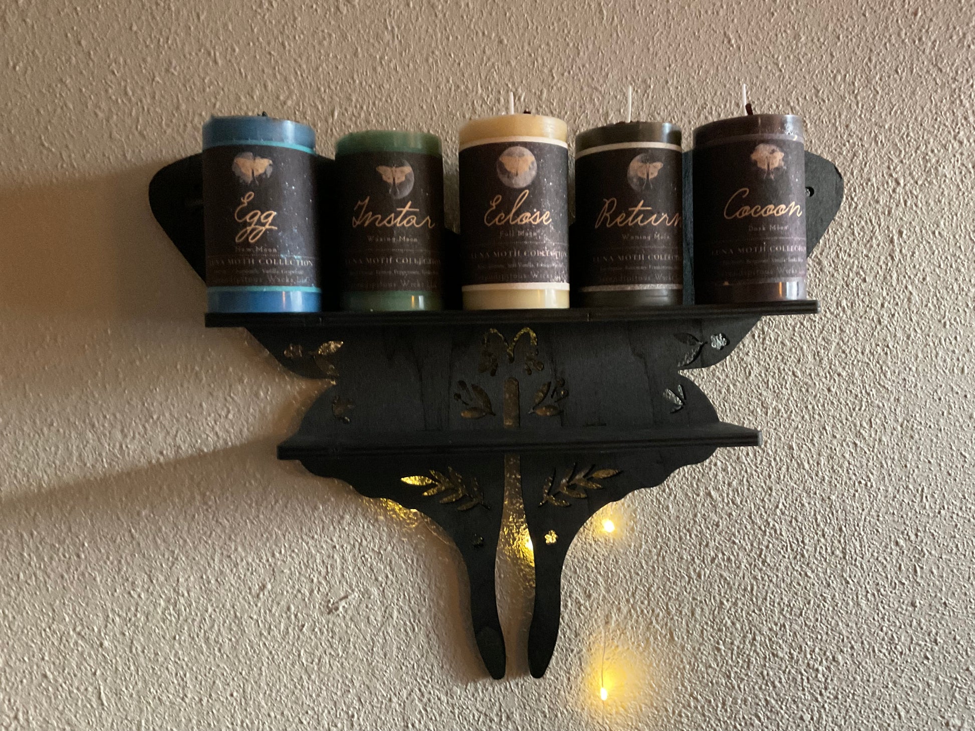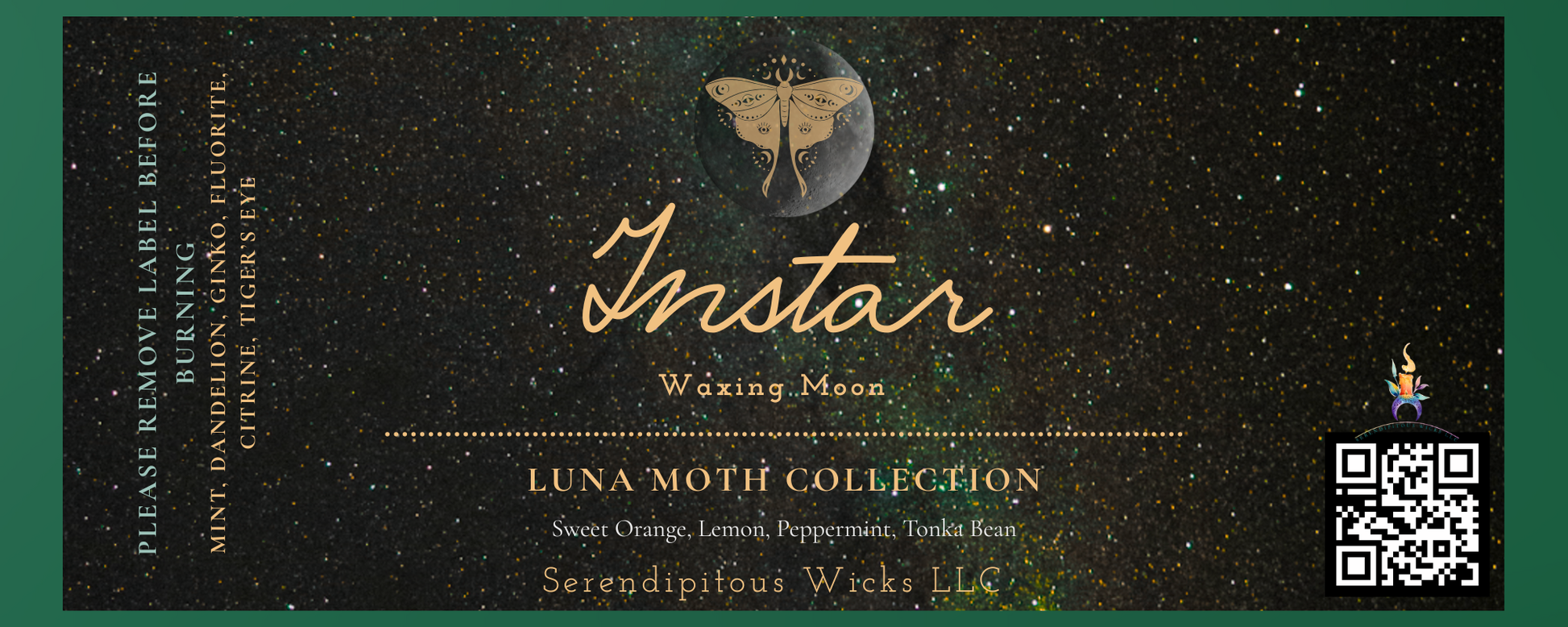 The Luna Moth Collection is a curated, non-customizable series of approximately 9 oz beeswax pillar candles, each aligned to a moon phase and a biological stage of metamorphosis. Every pillar carries a fixed scent blend, botanical allies, and crystal correspondences chosen for that specific threshold of transformation.